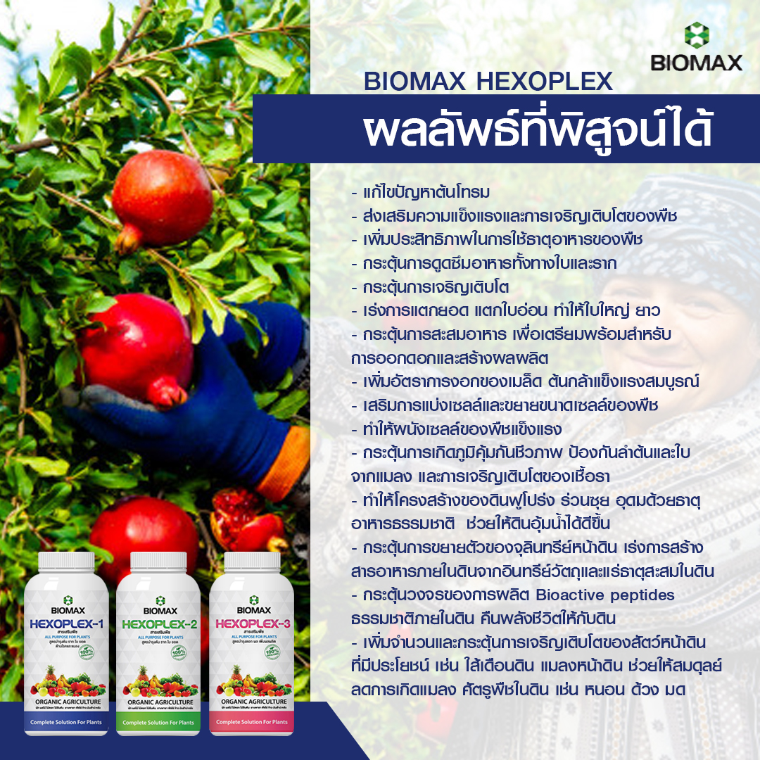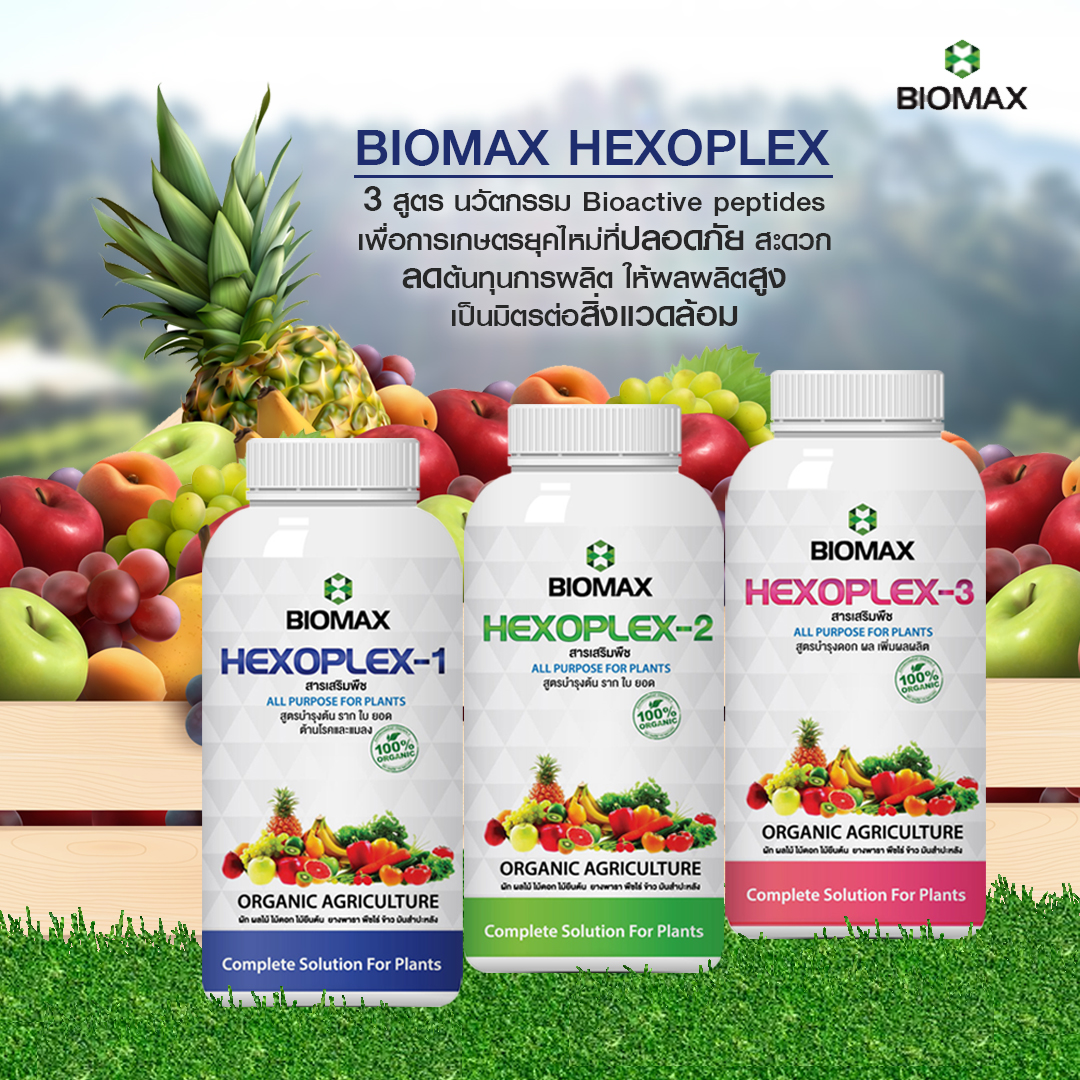 การค้นพบทางด้าน ไบโอแอคทีฟเปปไทด์ ซึ่งเป็นโมเลกุลสำคัญในการสื่อสารภายในเซลล์และระหว่างเซลล์ในต้นพืช ในการที่จะขยายแบ่งเซลล์เจริญเติบโต สร้างเซลล์ไหม่ เสริมภูมิคุ้มกันธรรมชาติ และนำส่งธาตุอาหารรวมถึงการสร้างความสมดุลและสมบูรณ์ภายในดินซึ่งเป็นระบบนิเวศ ในลักษณะที่เอื้อต่อการเจริญเติบโตร่วมกันระหว่างดินจุลินทรีย์ภายในดิน สัตว์หน้าดินและต้นพืช ทำให้เราได้คิดค้นและพัฒนานวัตกรรมของ Bioactive peptides คือ Biomax Hexoplex ขึ้นมาเพื่อเป็นคำตอบที่สมบูรณ์แบบของการเกษตรที่เหมาะสมในโลกอนาคต เพื่อสิ่งแวดล้อมและลูกหลานของเราในวันข้างหน้า